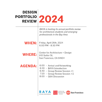 The AIASF Bay Area Young Architects (BAYA) Knowledge Community is hosting the annual Design Portfolio Review for architecture students and emerging professionals based in the Bay Area. Attendees will get the opportunity to have their work reviewed by professionals in the industry and receive tips about building/presenting their portfolio. This event will conclude with a Q&A discussion. BAYA insta is at https://www.instagram.com/baya_aiasf/