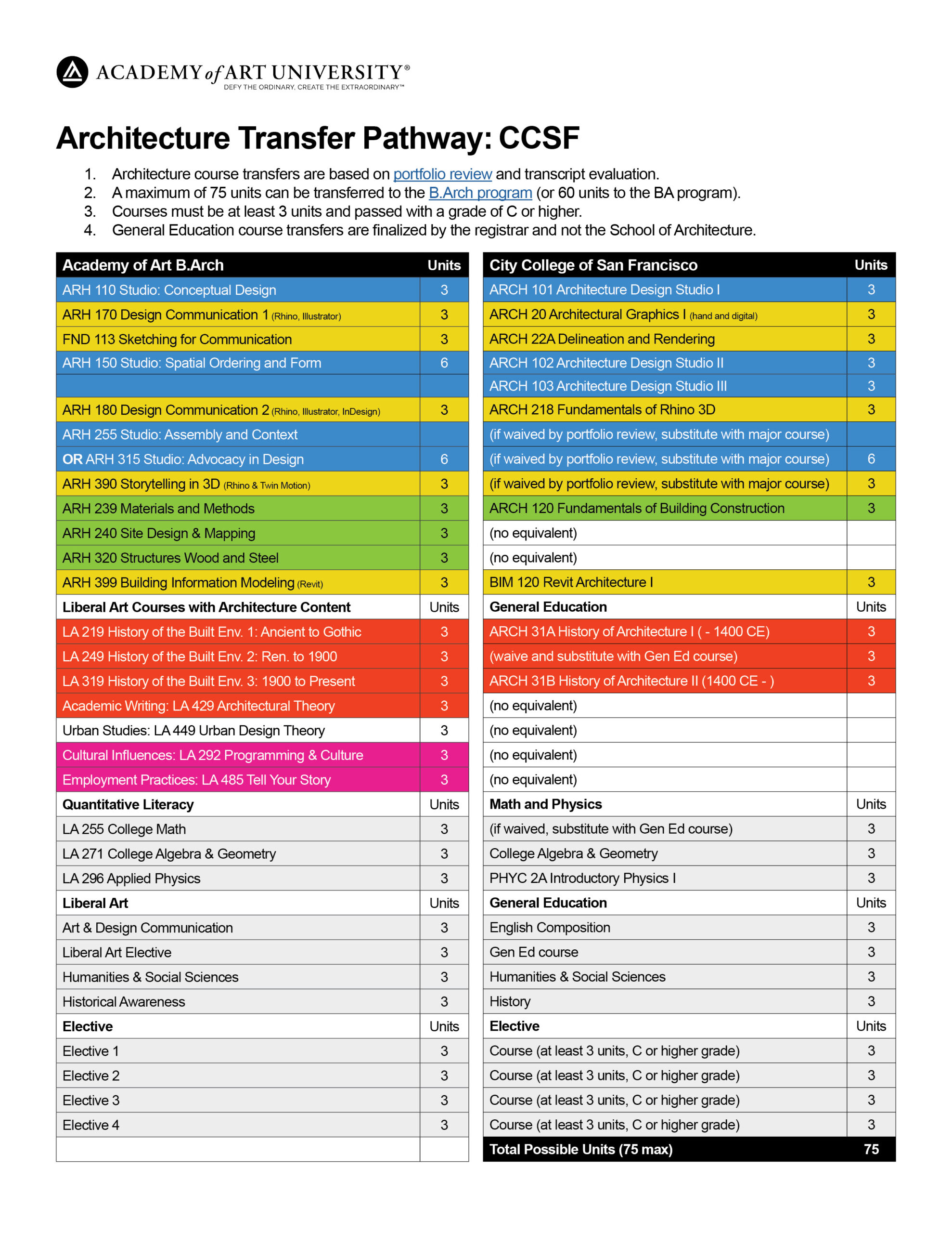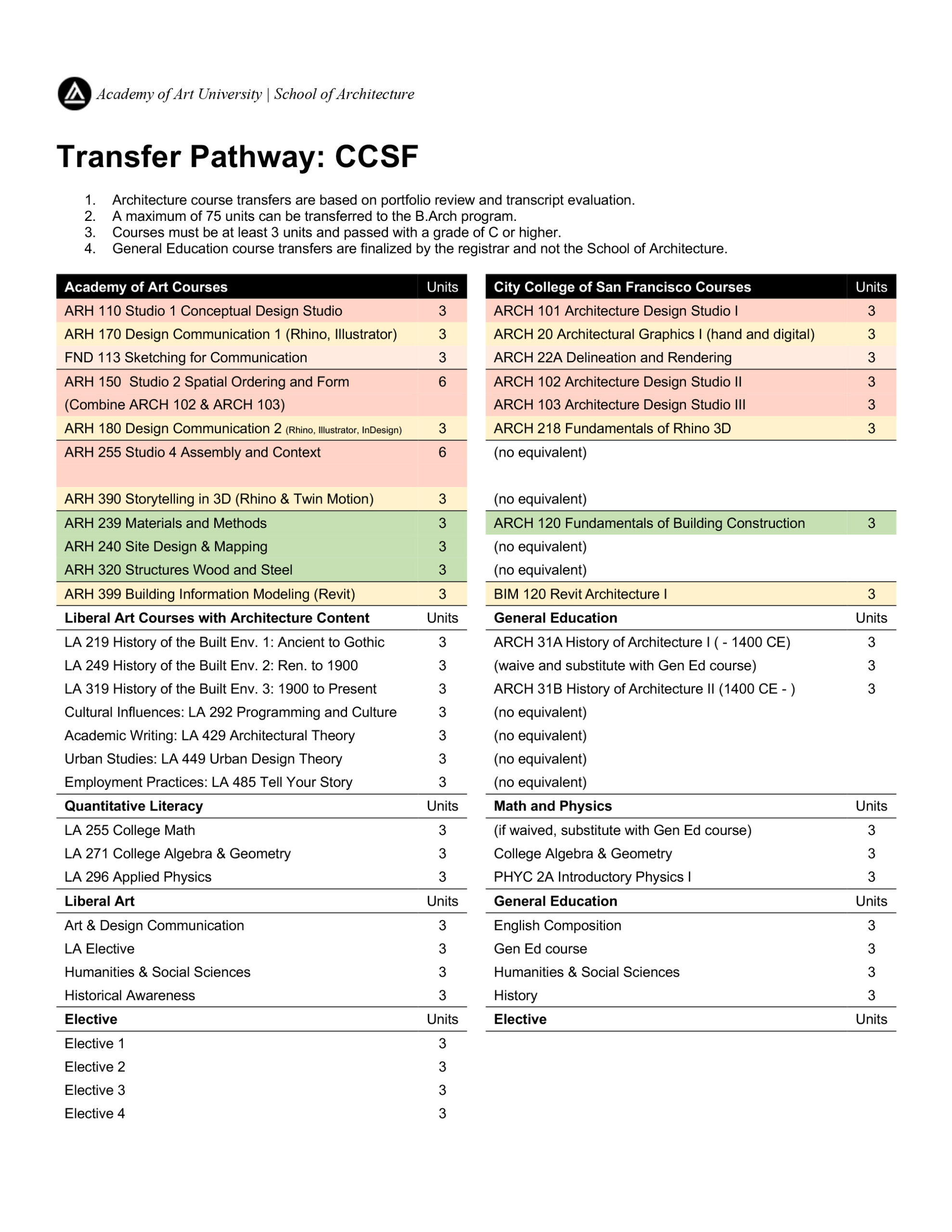This comparison table is our best estimate of equivalent Academy of Art courses based on CCSF AS in Architecture, Semester Breakdown, Course Descriptions, and General Education.