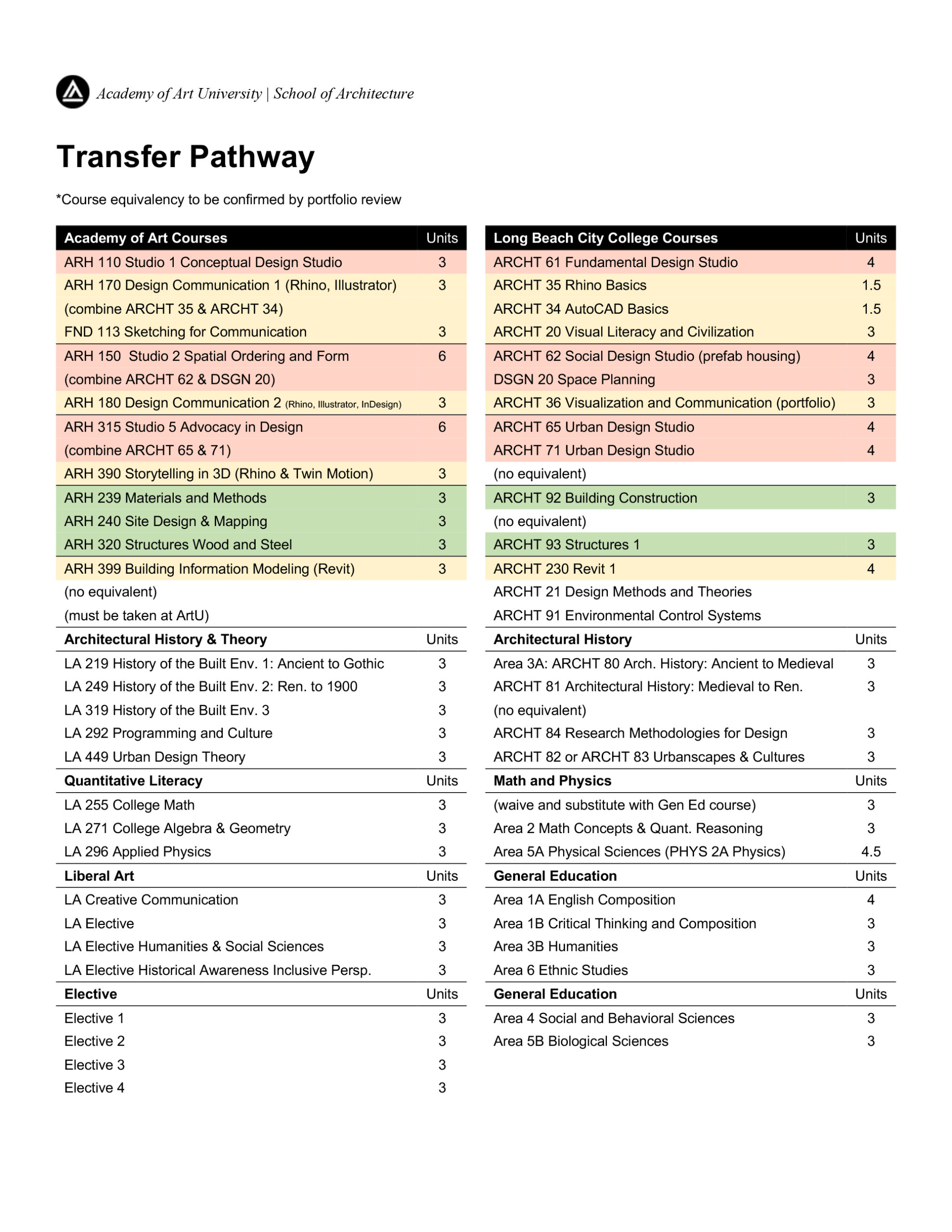 This comparison table is our best estimate of equivalent Academy of Art courses based on Long Beach City College course descriptions, AS in Architectural Design, and General Education (Cal-GETC). Architecture studio course transfers are determined by portfolio review.