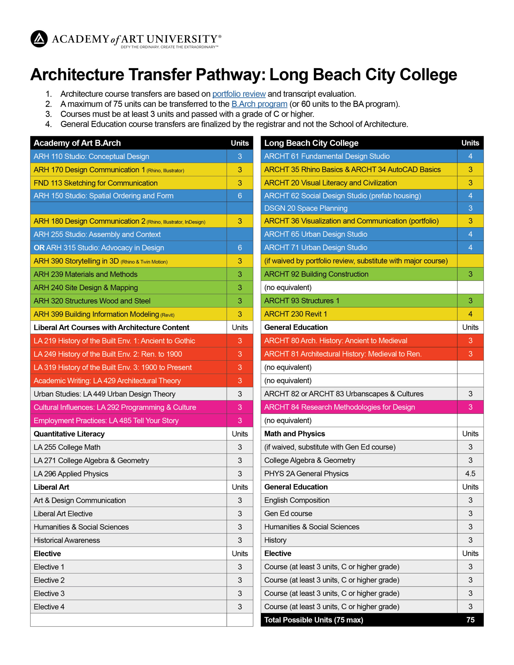 This comparison table is our best estimate of equivalent Academy of Art courses based on Long Beach City College course descriptions, AS in Architectural Design, and General Education.