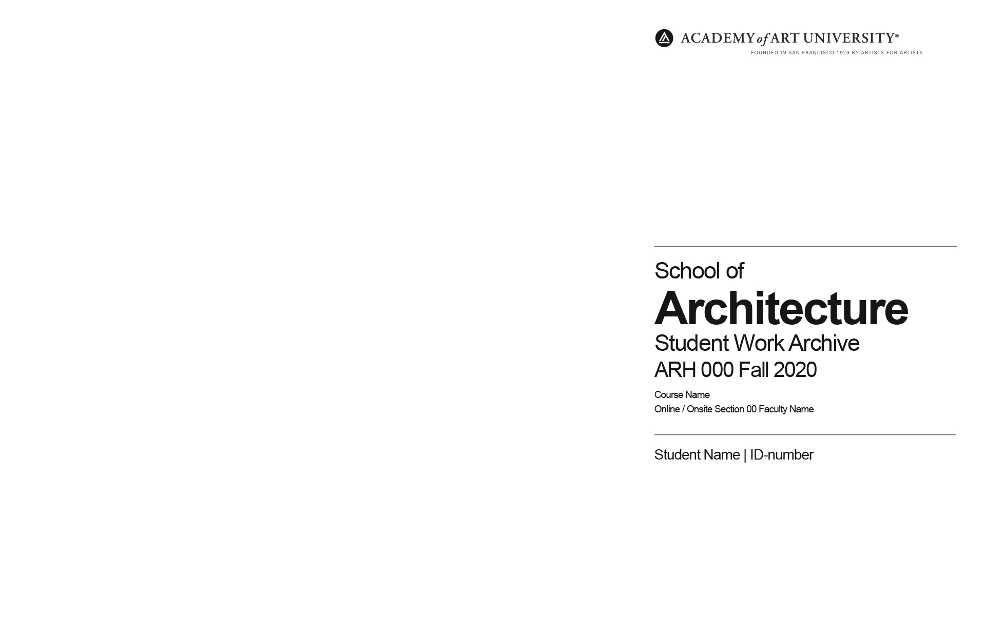 The Course Archive is a standardized way to collect student work from every student, every class, every semester at the School of Architecture, Academy of Art University. The student work collected in these documents constitute the evidence needed for compliance with NAAB (National Architecture Accreditation Board). Other purposes include review of student work for curriculum adjustments and selection of student projects for exhibitions. The quality and completeness of the archive document constitutes 10% of the final course grade as a department-wide policy. Non-submission of the course archive may result in a failing grade for the course.