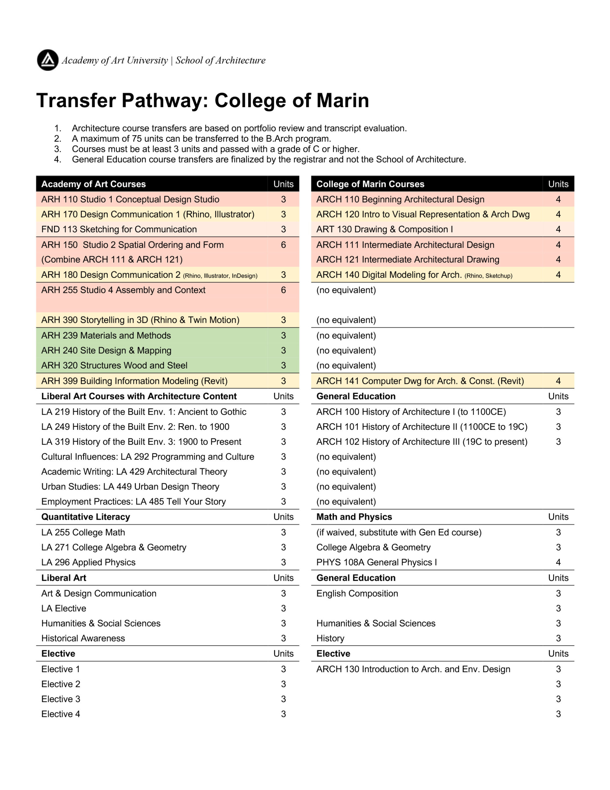 This comparison table is our best estimate of equivalent Academy of Art courses based on College of Marin course descriptions, AS in Architecture, and General Education.