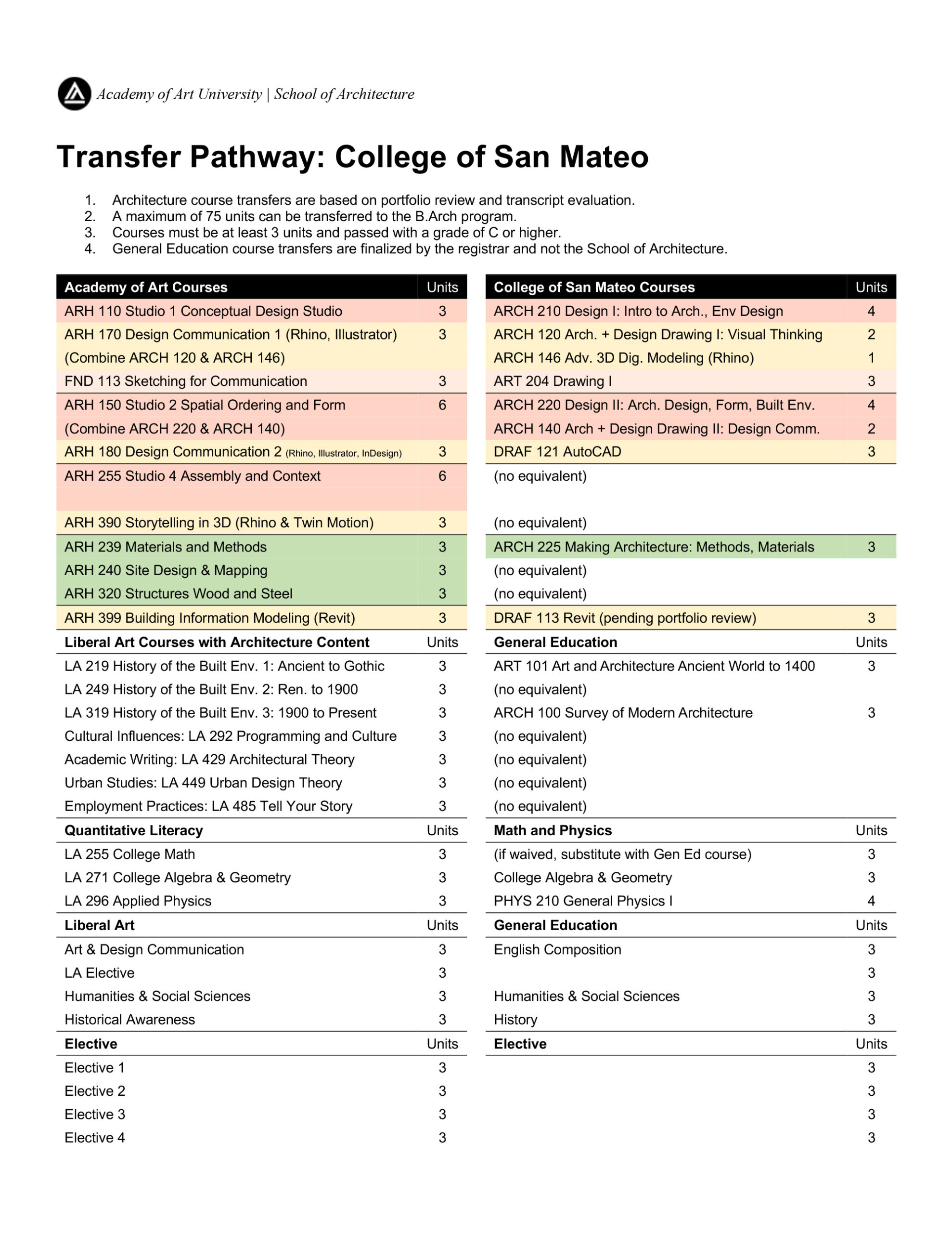 This comparison table is our best estimate of equivalent Academy of Art courses based on College of San Mateo Architectural Design AS, course descriptions, and General Education.