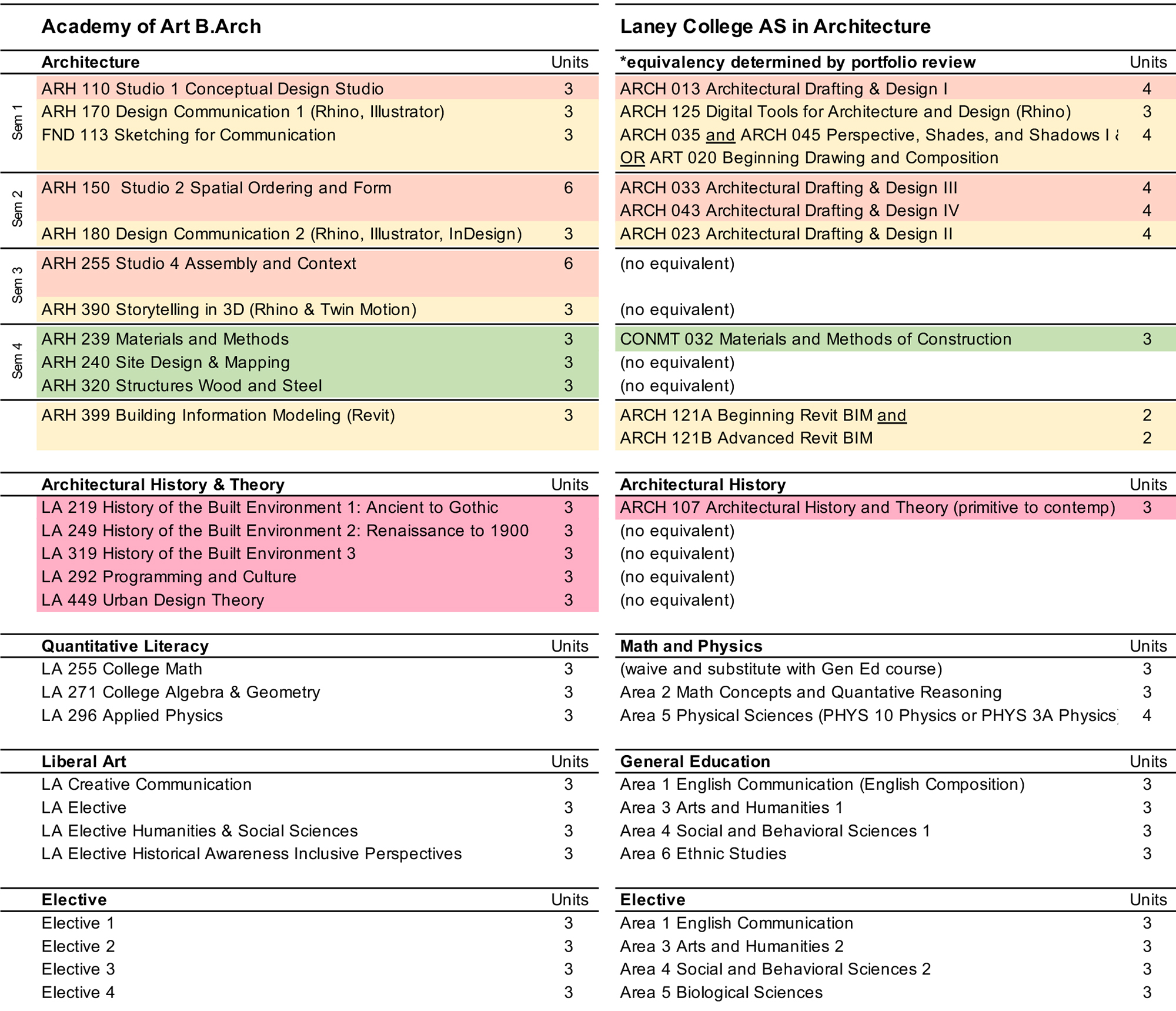 This comparison table is our best estimate of equivalent Academy of Art courses based on Laney College course descriptions, Associate of Science in Architecture, and General Education (Cal-GETC). Architecture studio course transfers are determined by portfolio review.