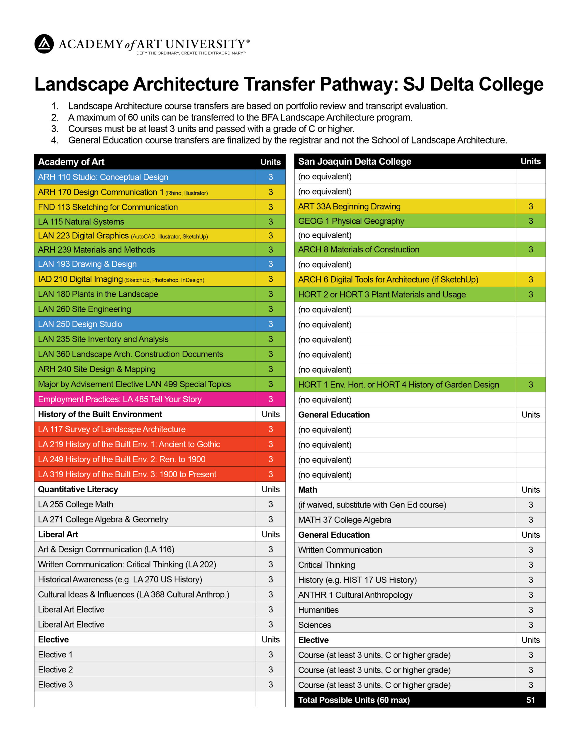 This comparison table is our best estimate of equivalent Academy of Art courses based on San Joaquin Delta College course descriptions, Horticulture program, Degree Map, and General Education.